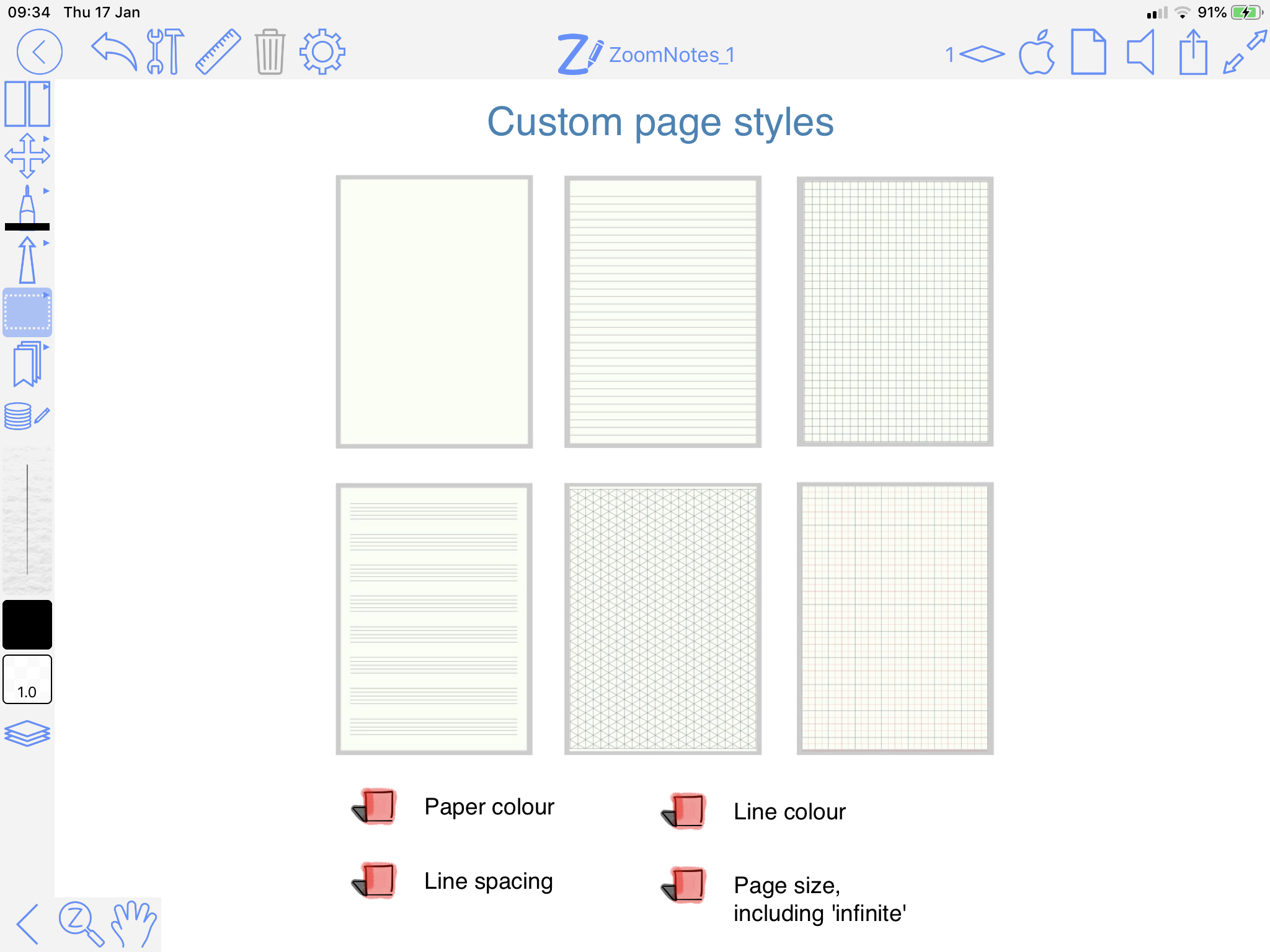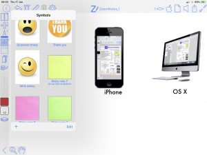 Typed textEnter typed text via keyboard (including bluetooth keyboards); with a wide range of fonts and font sizes, font colours, fills and borders. Text can be entered at all zoom scales and can be selected and moved, scaled and rotated as all drawing elements in ZoomNotes. |