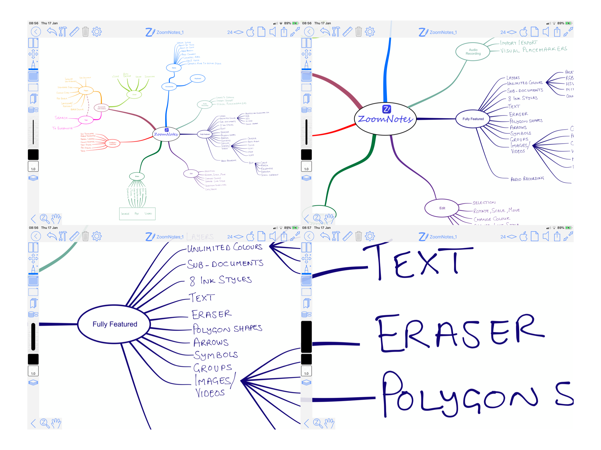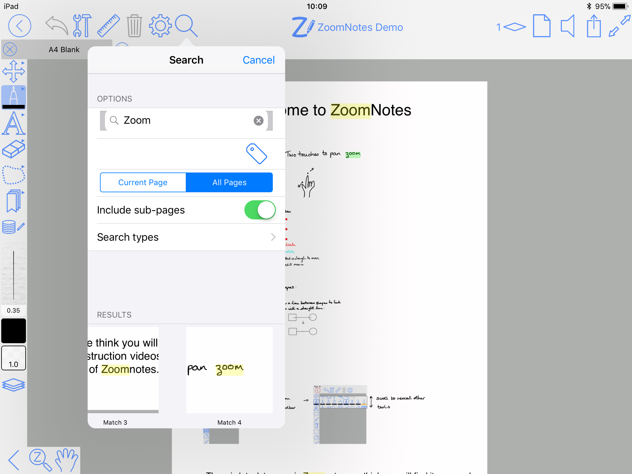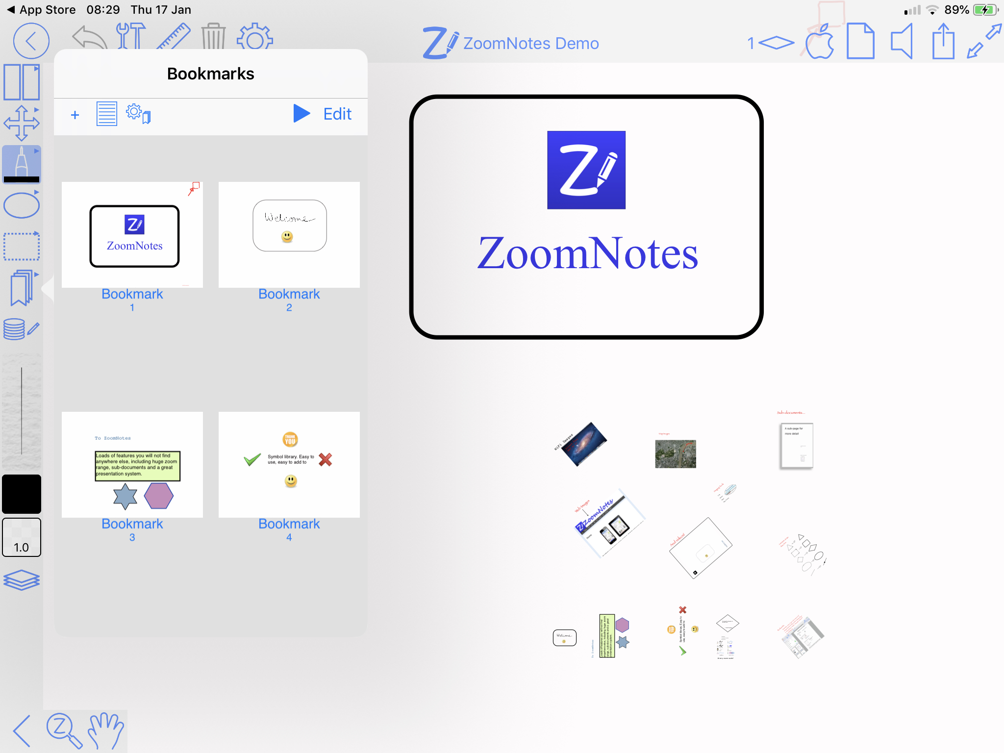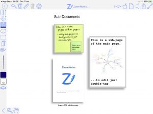 Sub-pagesThis unique feature allows you to use ‘pages within pages’. This allows you to use sticky-notes and enables the creation of hierarchical visual files. You can also insert whole PDF files as sub-pages, or import pages from other ZoomNotes documents into a sub-page. |