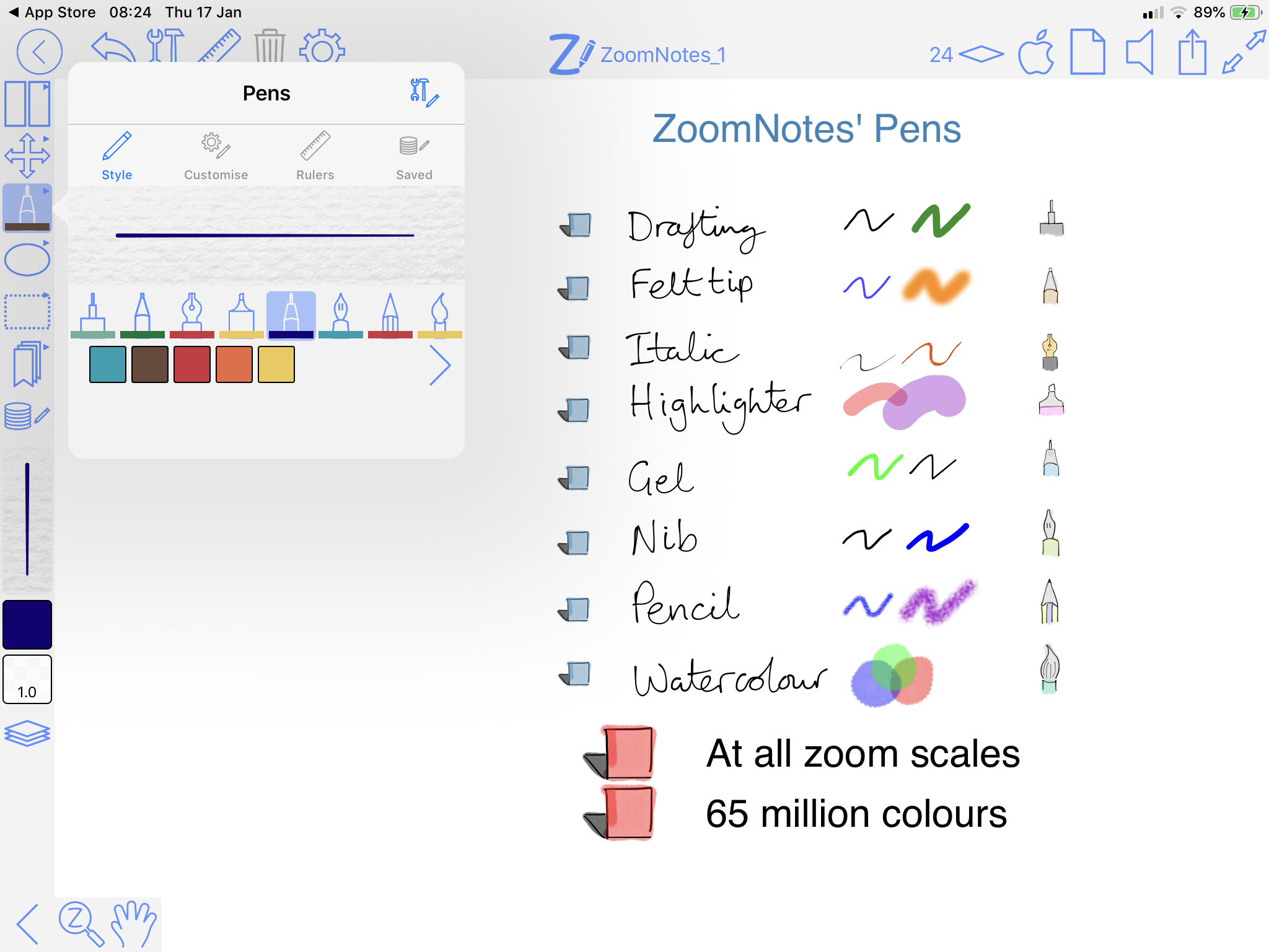 Multiple pensChoose from eight pens, including gel, nib, italic, watercolour and pencil and unlimited line thicknesses. |